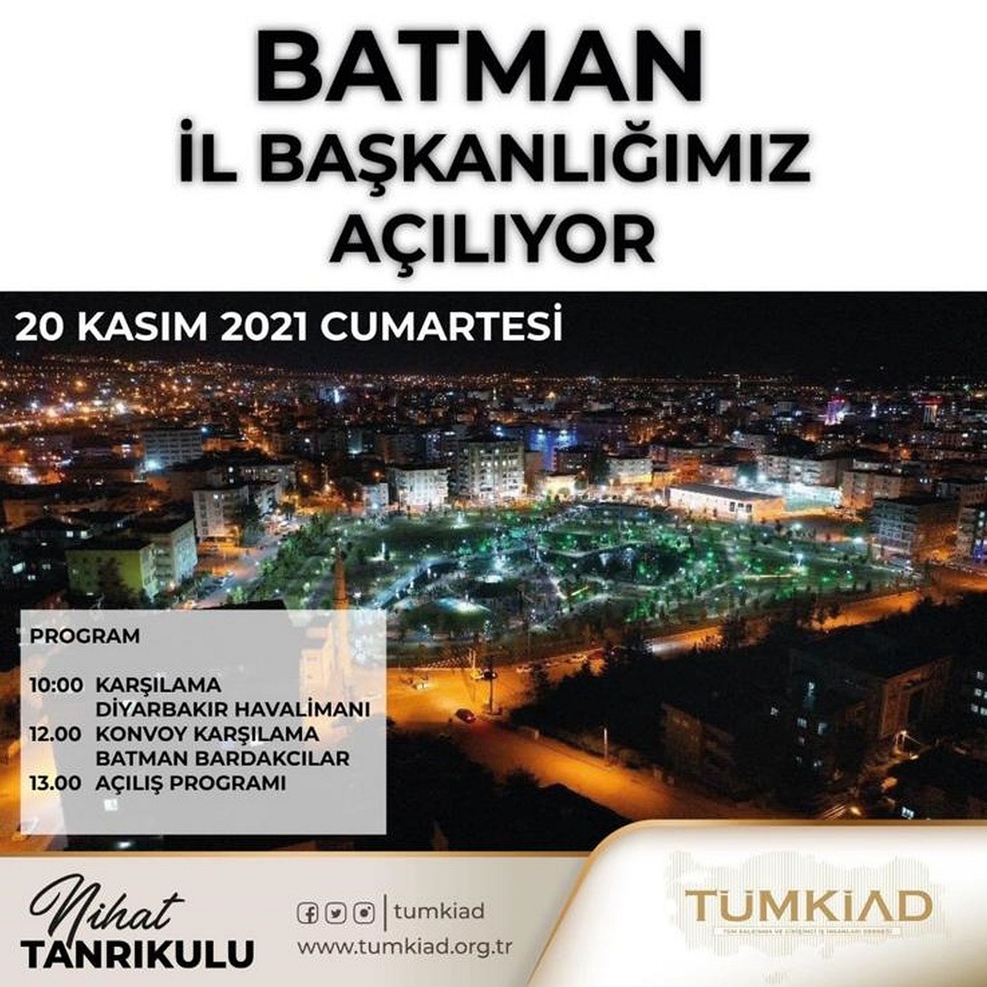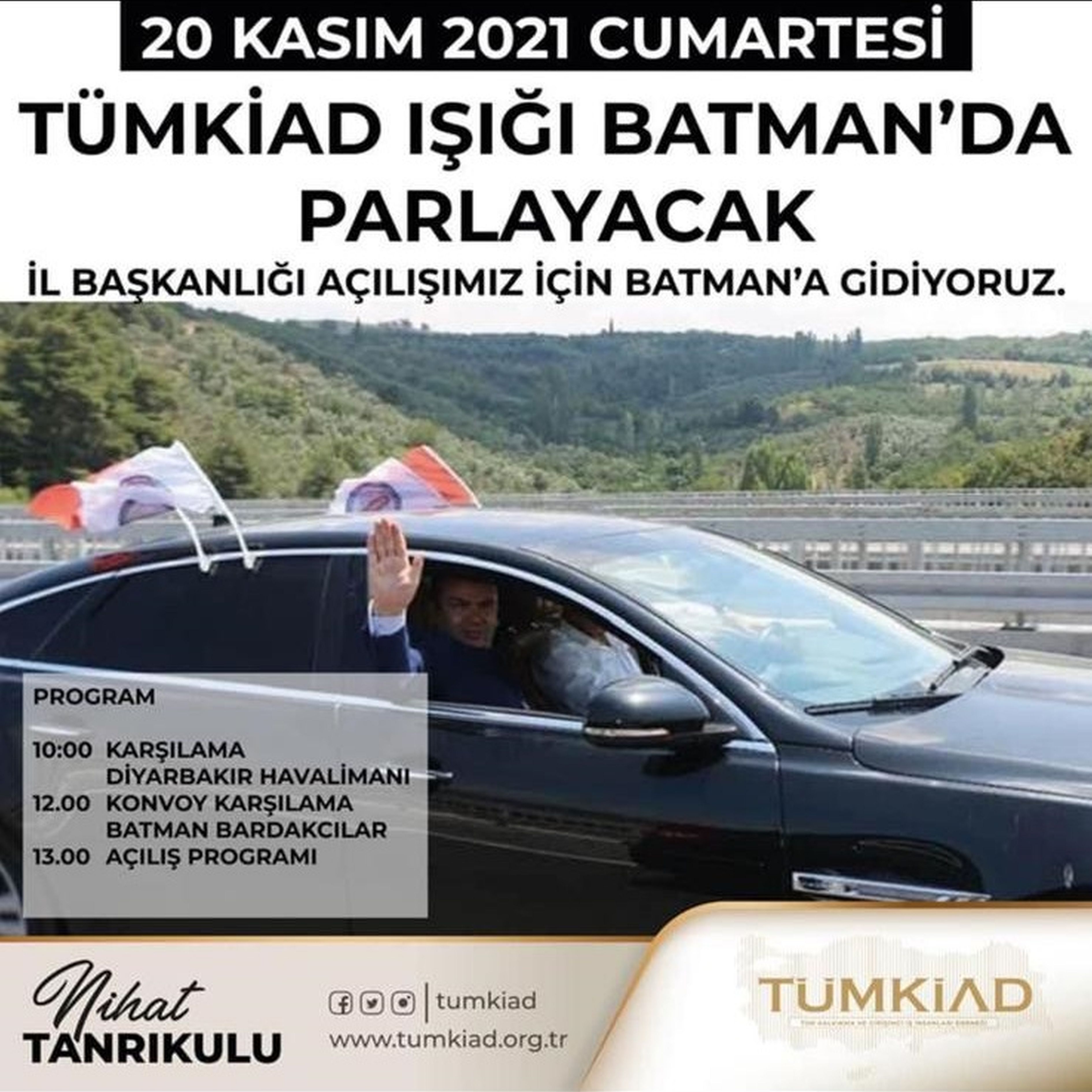 TÜMKİAD Batman İl Başkanlığını muazzam bir coşku, kalabalık ve büyük bir konvoy eşliğinde açtık. Açılışımız; Genel Başkanımız Sayın Nihat TANRIKULU ve yönetim kurulu üyeleri ile birlikte yurdun dört bir yanından gelen misafirlerin havalimanında karşılanması ile başlamış olup, büyük bir konvoy eşliğinde şehir turu yapılarak açılış alanına gidilmiştir. Açılışımıza Siyaset dünyasının önde gelen isimleri, bürokratlar, iş insanları ve halktan katılım sağlanmıştır. Açılışımıza katılan tüm konuklarımıza gönülden teşekkür ediyoruz.